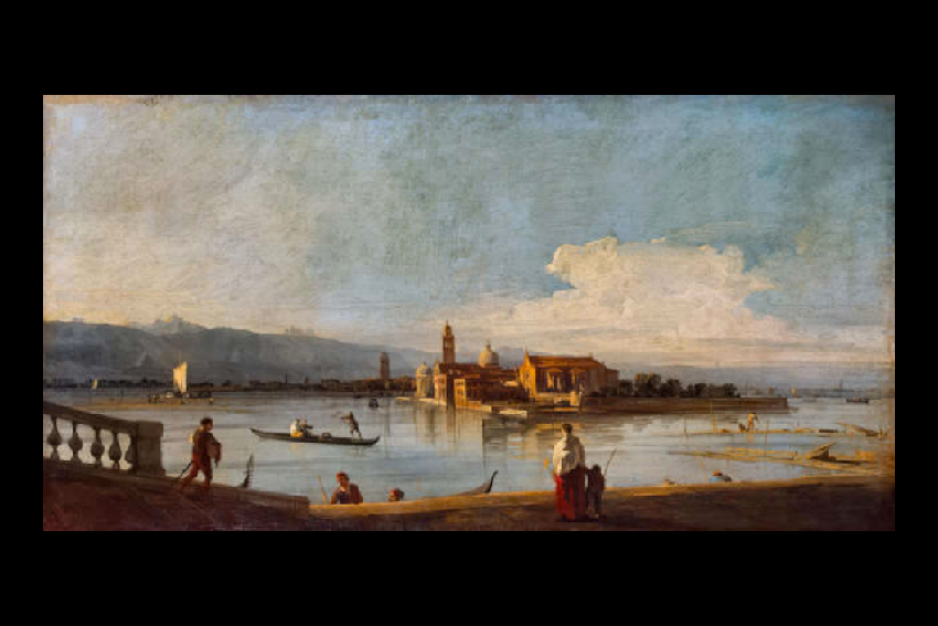 On peut noter que le ciel se reflète dans l’eau et qu’il prend plus de la moitié du tableau. Au-devant plusieurs personnages, ils dominent, ainsi, la scène. Puis, on remarque que l’île de San Michele, son église et son campanile sont inondés par le soleil, ce qui contraste avec le premier plan sombre. Tandis qu’au second plan, des embarcations sont en mouvement sur l’eau.