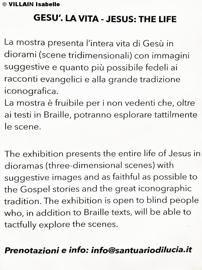 L’exposition Gesu la vita, la vie de Jésus par Francesco Bonvissuto est une exposition qui présente la vie de Jésus à travers différentes scènes en trois dimensions. Que l’on soit croyant ou non croyant, cette exposition retient l’attention par sa dimension spectaculaire.