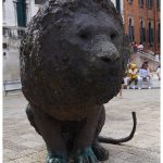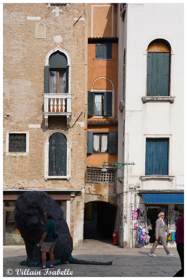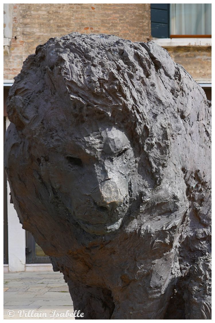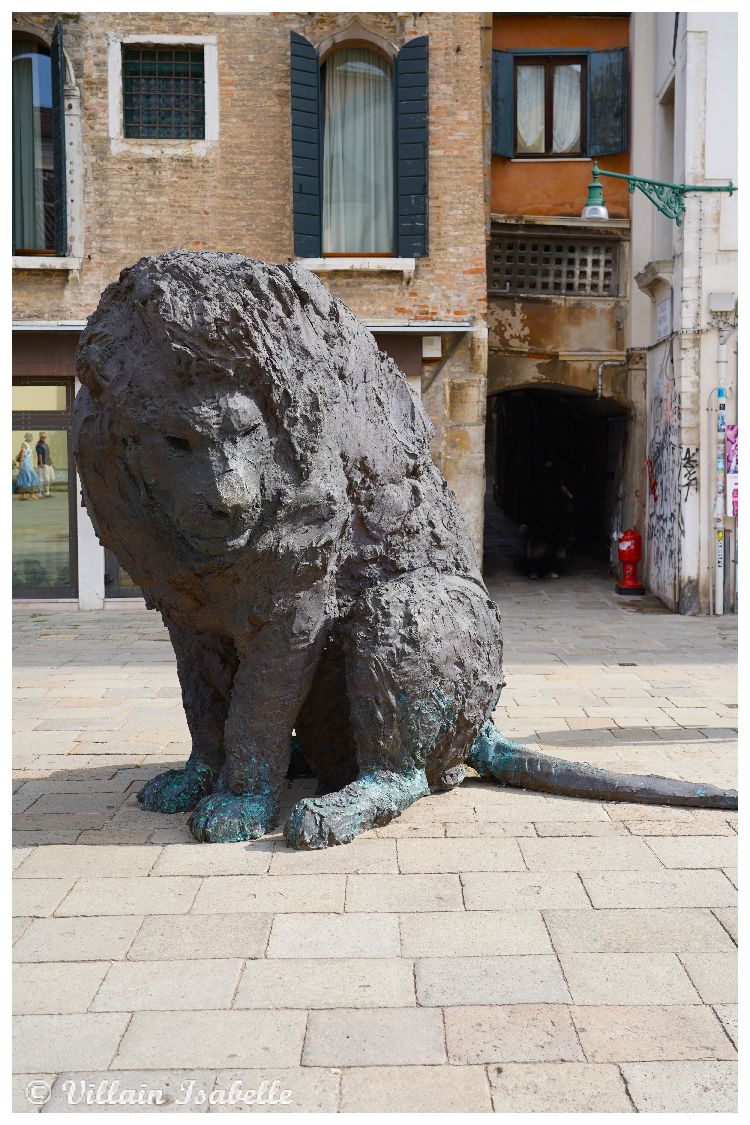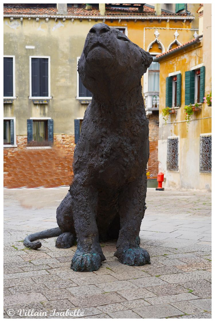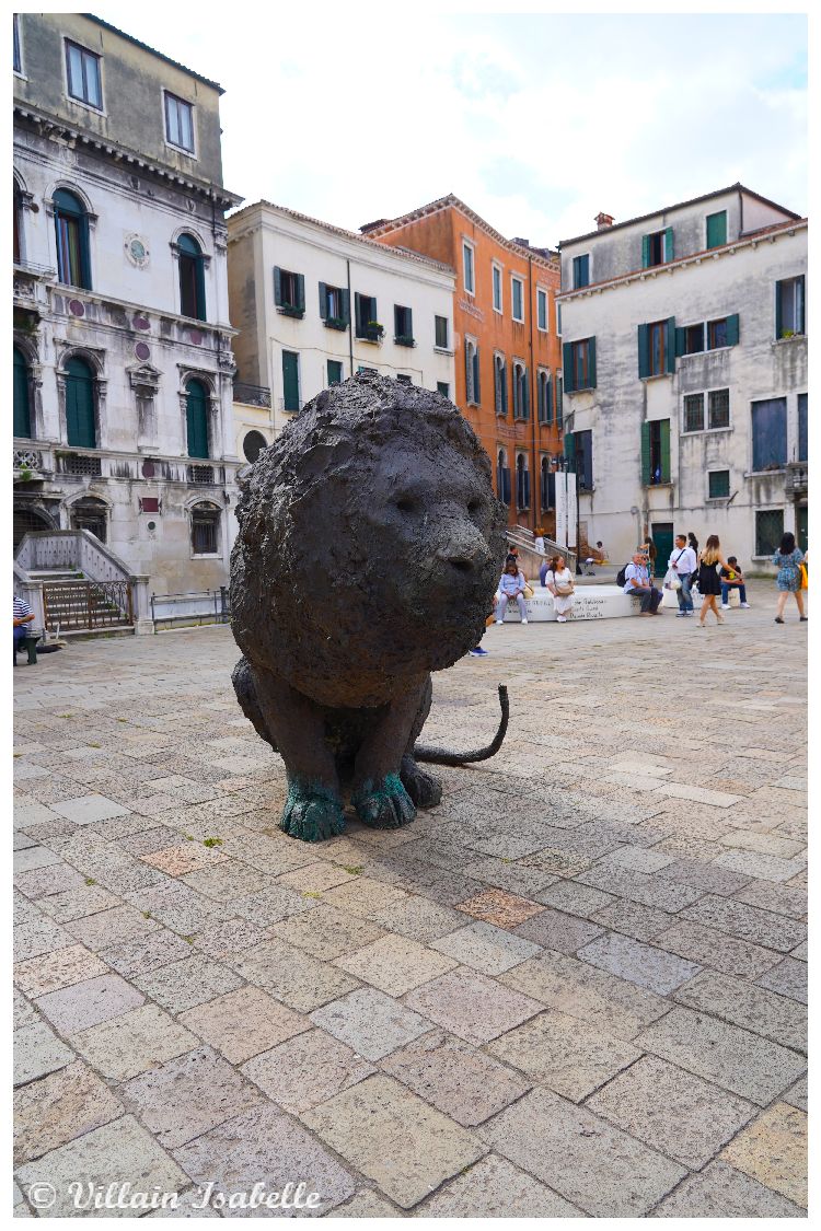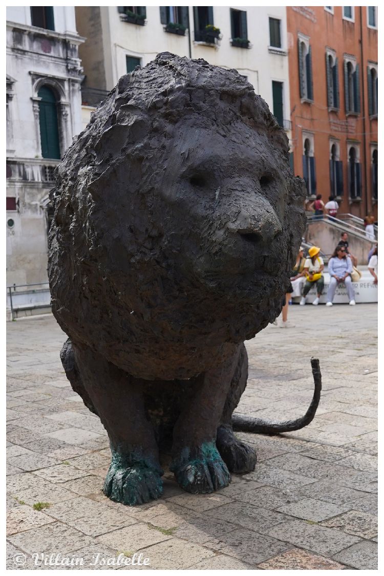 Ces sculptures monumentales de l’italien Davide Rivalta représentent des lions et ils sont en bronze. Regardez les pattes de ces lions. L’artiste Davide Rivaltare a choisi le lion. Vous avez sûrement compris pourquoi ? Le lion évoque Venise avec le lion de Saint-Marc, un des symboles de la ville de Venise. Avec sa série Lions on the Field, on sent bien que Rivalta a longuement observé chaque animal en captivité. Le but est de le reproduire dans une taille légèrement plus grande. Les deux lions et deux lionnes de Davide Rivalta sont assis, mais prêts à se mouvoir. Ils semblent être des sentinelles sur le campo Santa Maria Formosa.
