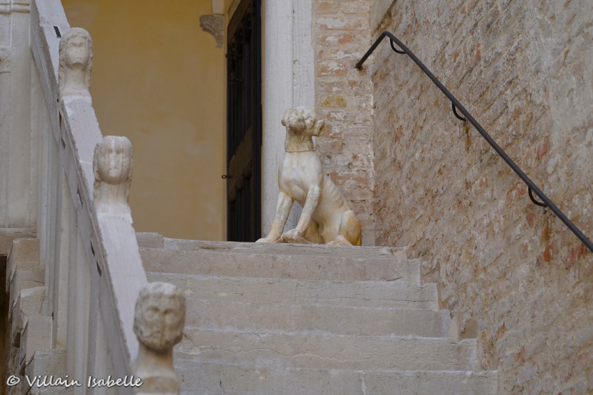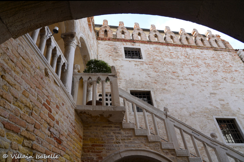 Les 2 cours intérieures possèdent chacune un escalier. Chacun des deux escaliers extérieur dispose d’une balustrade qui porte des décorations en pierre d’Istrie, sculptées en forme de têtes d’humaines.