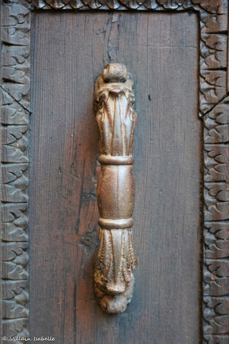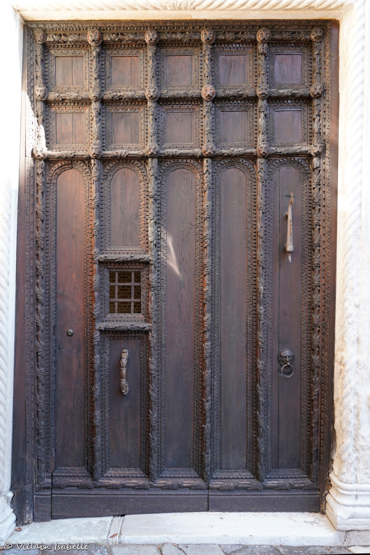 Une des deux entrées, la plus monumentale, se trouve Fondamenta Van Axel ou de le erbe. Qui n’a pas admiré et souhaité entrer par ce portail ? Il est en bois d’origine avec lunette et les armoiries des Van Axel. On peut y admirer le heurtoir de porte, qui date du XVe. L’autre entrée terrestre, se situe quant à elle, Calle a fianco la chiesa.