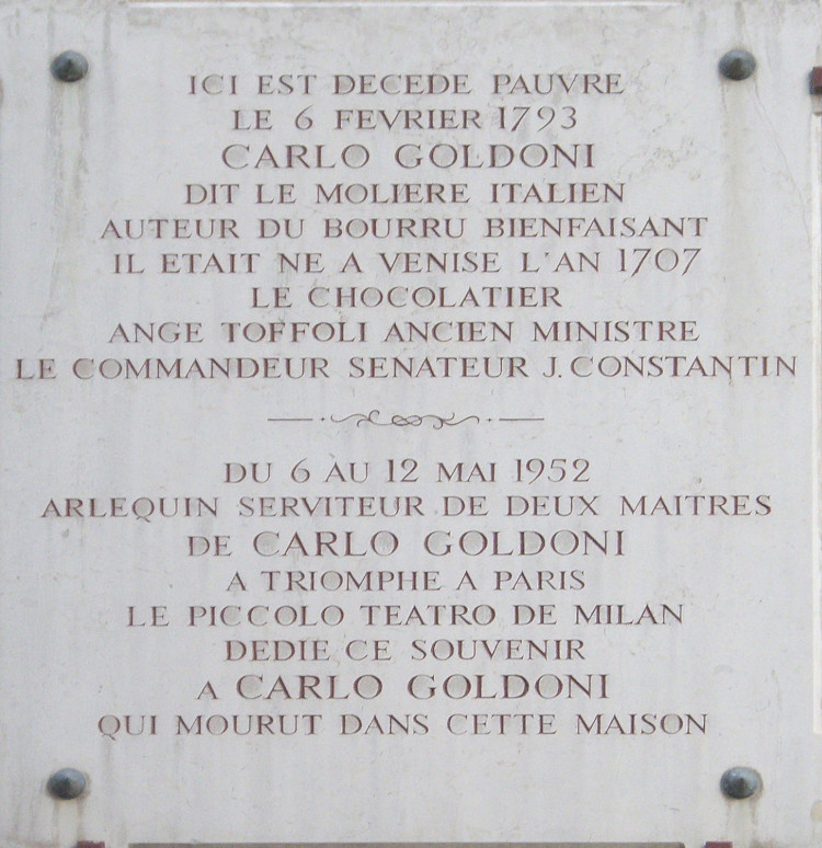 En 1762, Carlo Goldoni part de Venise, il prend son temps en voyageant. Au bout de quatre mois il va enfin arriver à Paris. Il est très apprécié par le Roi de France qui va lui accorder une pension. Supprimée par la Révolution, dès lors il va vivre dans la pauvreté. Carlo Goldoni meurt à Paris le Le 25 Juillet 1824, le cimetière Sainte-Catherine ferme définitivement ses portes, juste parce que le cimetière de Montparnasse est mis en service. Le buste de Carlo Goldoni (1707-1793) se trouve dans le square Jean XXIII, 4e arrondissement de Paris, près de Notre-Dame. Il s’agit de l’œuvre d’Edouard Fortini en 1906.