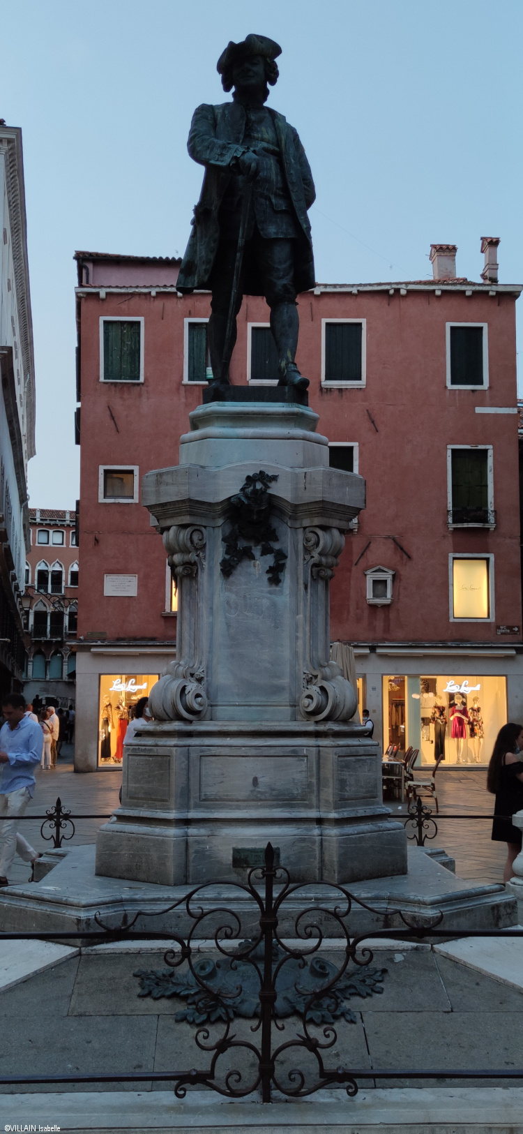 La statue de Carlo Goldoni à Venise repose sur un piédestal de style rococo de l’architecte Pellegrino Orefice. De plus des masques ornent les quatre faces sur socle.