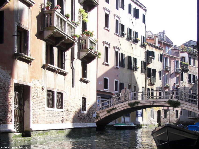 A Venise une rue porte aussi le nom de Goldoni, la calle Goldoni mais aussi un pont et une fondamenta. Premièrement de la fondamenta Carlo Goldoni vous gravissez le pont qui vous emmène vers le campo San Luca. Et deuxièment le ponte Carlo Goldoni enjambe le rio dei Fuseri pour rejoindre le rio Scoacamini. En outre, c’est un pont en pierre d’Istrie construit en 1909, il mesure 12m28 en longueur, 3,75 en largeur et il est haut de 2m79.