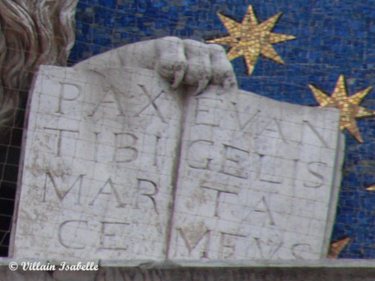 Au-dessus encore de ces mécanismes et à côté du doge Barbarigo, se trouve la statue symbolique d’un lion ailé de Saint-Marc, la patte sur un livre ouvert, en signe de paix. Car en temps de guerre, ce même lion aurait en sa possession une épée. Il se détache sur un fond de ciel étoilé. Notez que tout pacifique qu’il soit, à bien le regarder en face, il a plutôt l’air assez patibulaire.